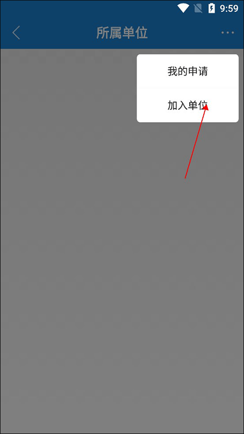 2、进入去后能看见因为我们没绑定的问题这什么也没有,这个时候我们需要点击右上角的三点图标,点击过后会跳出2个入口:我的申请和加入单位,我们先点击进入单位,等我们填写完申请资料后纪录就会在我的申请里面出现;