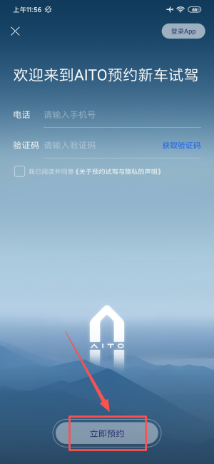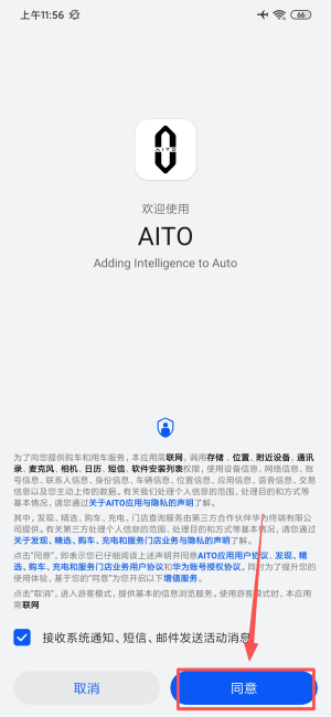 1、在隐私声明提示界面点击"同意",即可进入AITO应用。