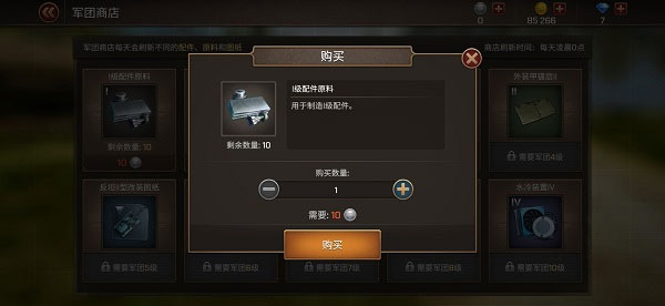 2、通过军团捐献、完成军团任务等途径可以获取军团币,在军团商店中所有物品都只能由军团币购买。军团商店每天会刷新不同的配件、原料和图纸,且每种物品数量有限;买完的话今日就无法再次购买,只能等待每天的凌晨0点系统自动刷新军团商店。