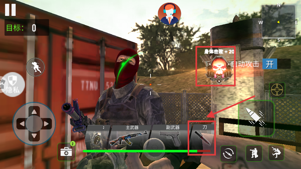 2、瞄准敌人,开启【自动攻击-开】,利用主武器射击,目标剩【2】时注意走位躲避。