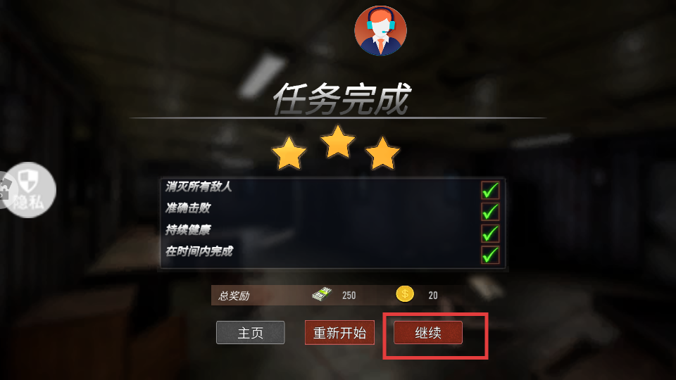 4、任务完成后点击【继续】,领取【250】金币和【20】钻石,进入下一关挑战。