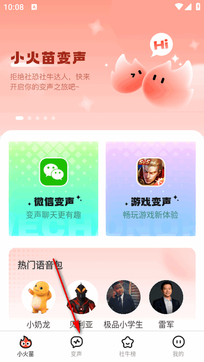 1、打开软件主界面,点击底部的变声选项进入语音包选择页面。