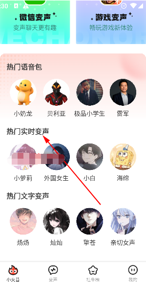 1、打开手机中的小火苗app,进入主界面后选择“实时变声”功能。