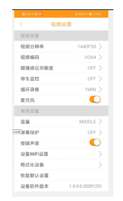3.连接行车记录仪,登录roadcam,连接到主界面,点击连接记录仪,到WIFI列表界面实行连接,显示连接成功。设置摄记录仪主要参数,如修改WIFI密码,录音,显示水印时间,移动侦测,碰撞灵敏度,视频分辨率等。