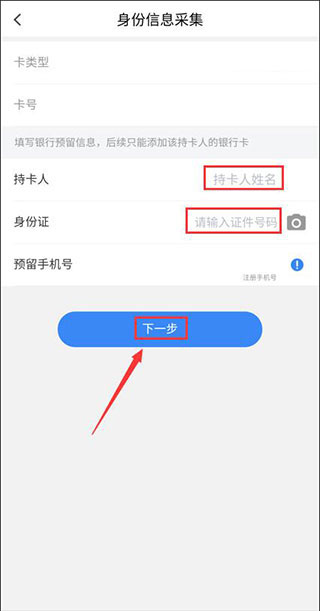 5、这里我们就进入了身份信息采集页面,其它信息都是自动生成的,我们填写完持卡人姓名和证件号码后,再点击下一步。