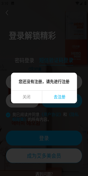 2、点击登录之后输入自己的手机号码和验证码,这里会显示新号需要注册。
