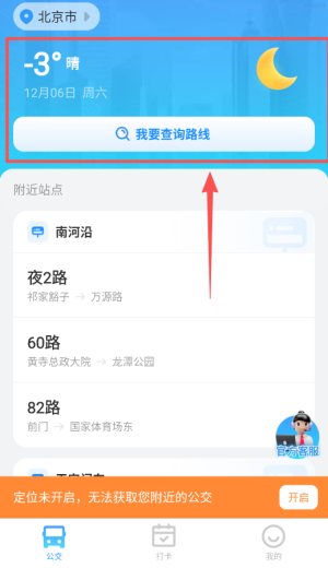 1、打开app后先开启定位权限,系统会自动显示你附近的公交站点和线路信息,还能看到最近车辆的预计到达时间。