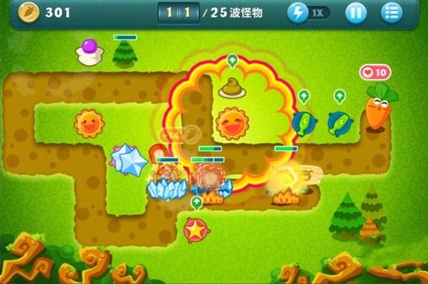 2、如图所示,太阳炮塔周边的道具摧毁后,会得到1个便便、2个瓶子炮塔,先不用升级,太阳炮塔全力攻击风车道具,怪物进入太阳炮塔攻击范围内时,自然会被消灭。