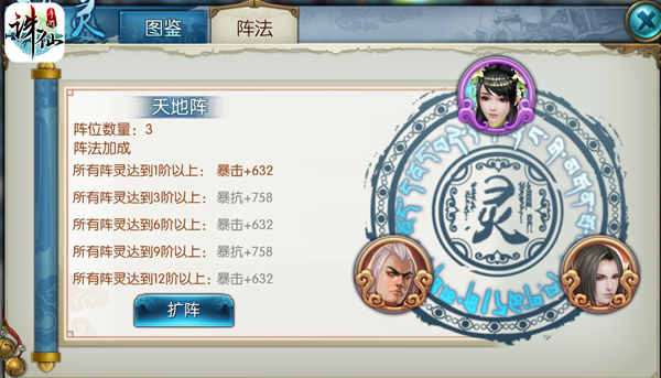 玩家可以通过任务、副本以及游戏内活动获取阵灵,收集足够阵灵即可激活阵法,获得属性加成。阵灵可通过阵灵碎片提升品阶,品阶提升将提升阵灵的加成效果。阵灵分为橙色、紫色、蓝色、绿色四个品质。