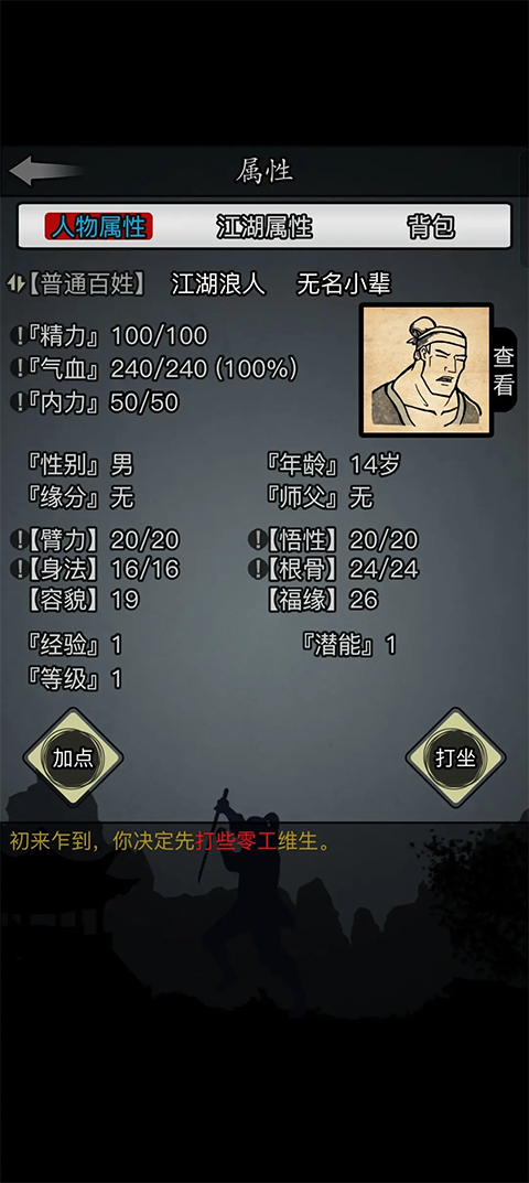 出身:武学世家影响臂力和根骨,书香世家影响悟性和容貌,商人影响金钱,孤儿影响福缘