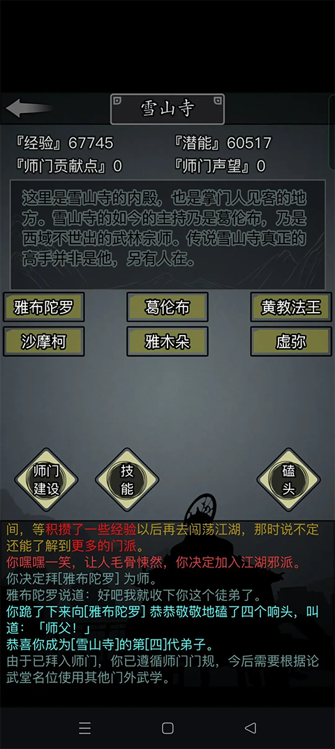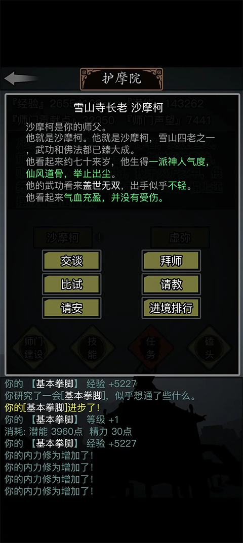 拜师后我们点击师门就可以进入师门主页面,一般来讲只有五个人,前三个是你可以拜师的师傅,第四个是讲门派故事的老登,第五个是卖门派残页的小登。有的门派特殊,有多个师傅如上图