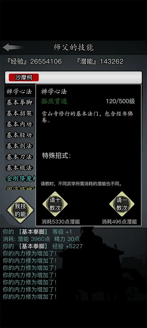 练功:目前除了基本武学和内功外其他武学可以通过练功来提升等级,但是注意,练功提升的武学等级受人物等级和基本武学的限制,因此在挂机练功时会中断,大家务必注意自己的基本武学等级和人物等级
