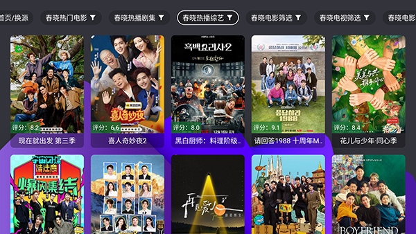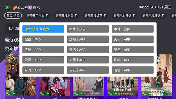 采用 横向分类导航 + 纵向瀑布流海报墙 设计,内容一目了然。只需方向键滑动,即可快速选片、播放,告别复杂菜单。