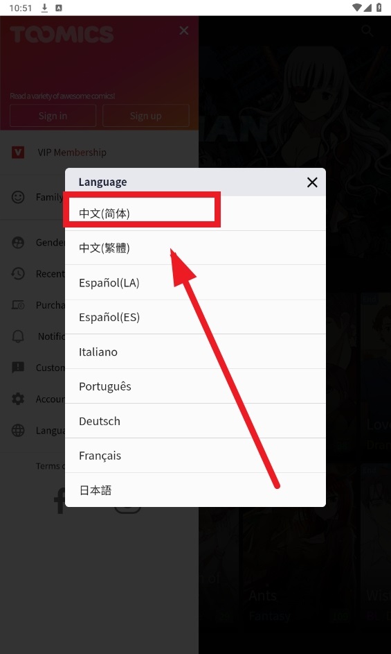 打开Toomics app,点击左上角home旁边的图标;