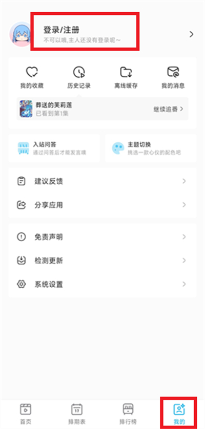 1. 若想进入站点,首先需登录您的账号。请点击【我的】选项卡,然后选择“登录/注册”,以进入lanerc动漫软件平台。
