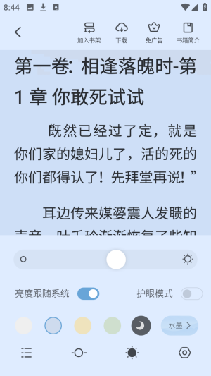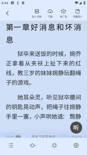 软件提供丰富的个性化阅读设置:支持自定义字体大小、亮度调节,具备护眼夜间模式;阅读疲惫时,可切换至听书模式继续享受内容。更支持一键下载全书到本地,方便离线随时阅读,功能全面且贴心。