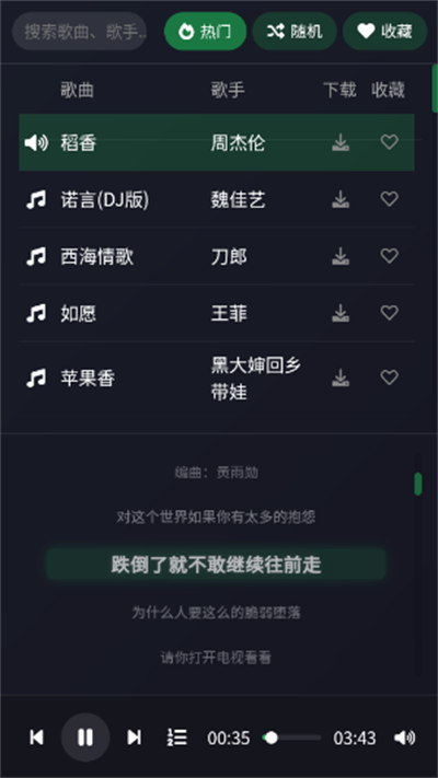 2、接着任意选择一首你喜欢的歌曲,这里以“稻香”为例,点击即可播放。