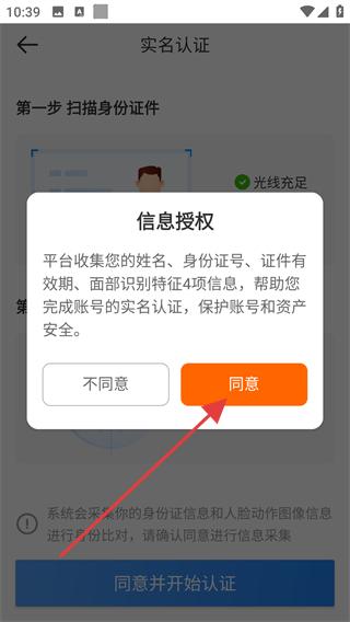 3、进入实名认证页面可看到扫描身份证件和人脸识别两步流程,确认光线充足等条件满足后,点击同意并开始认证按钮。
