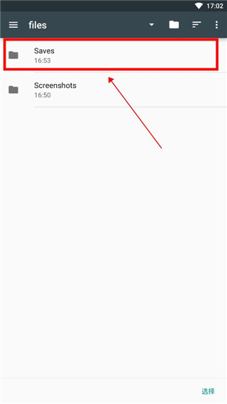 注意:文件查找到这里就可以停止了,在进入【Saves】后就可以点击下方的选择了。这里出现的文件是我们刚才第一个步骤建立的游戏存档,我们不需要进入游戏存档中,进入游戏存档中再点选择是无效的。