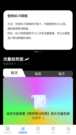 动态流量仪表盘:以图表形式实时展示流量使用速度、剩余量及预计可用时间,支持按日/月切换视图。