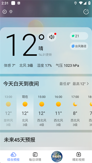 根据你的定位实时展示天气状况,并提供体感温度、风向风力、湿度、气压等详细数据帮助用户全面掌握天气变化。