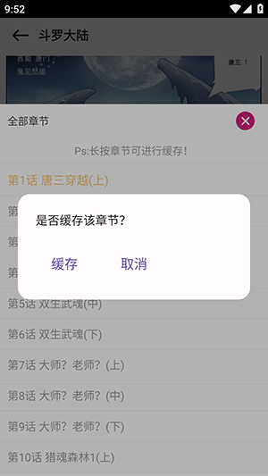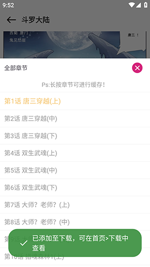 2、长按想要缓存的目录章节即可开始下载缓存。