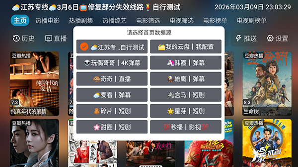 1、软件自带影视源接口配置,点击左上角的主页选项可以进行切换。