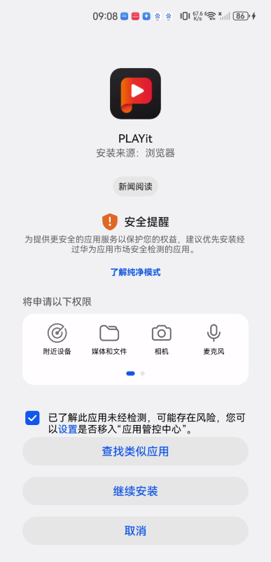 3、点击勾选“已了解此应用未经检测……”,点击“继续安装”。