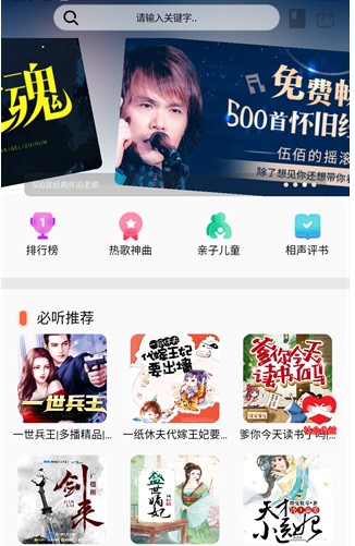 1、打开声阅听书纯净版软件,直接进入首页,有排行榜,热歌神曲,亲自儿童和相声评书四个分类