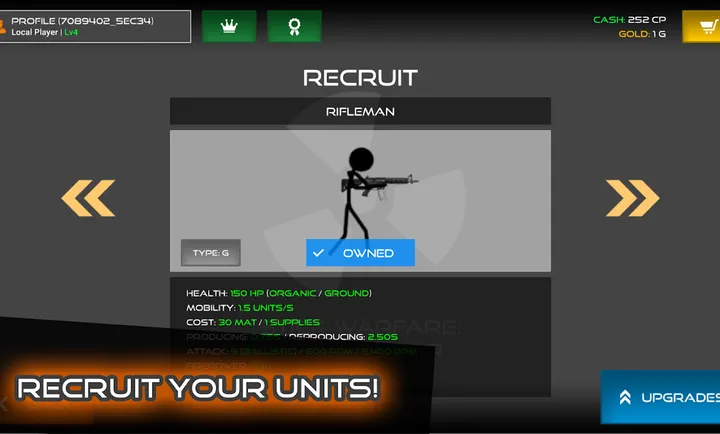 3、能通过战斗赢取金币现金解锁升级单位,还可进行全局升级提升战斗效率等。游戏有史诗级2D战争等特色。