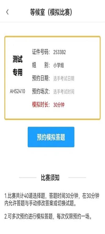 步骤六:“赛前模拟”模块,可预约模拟答题时间,进行赛前模拟答题。