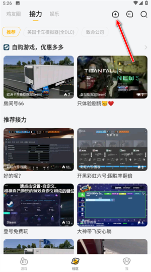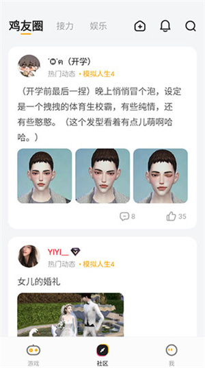 3、点击进入社区界面,鸡友圈可以发布游戏动态,接力是分享游戏视频内容的,娱乐是用来查看游戏榜单