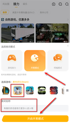 3、选择开黑模式,然后选择你想要玩的游戏,输入游戏房间名称,名称可以随便,最后点击下方的开启开合模式按钮