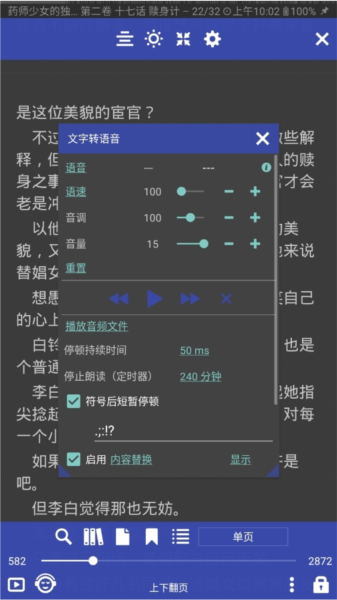 点击左下角可以进行文字转语音,从而开启听书模式,但是前提是你手机里安装且支持TTS语音引擎。