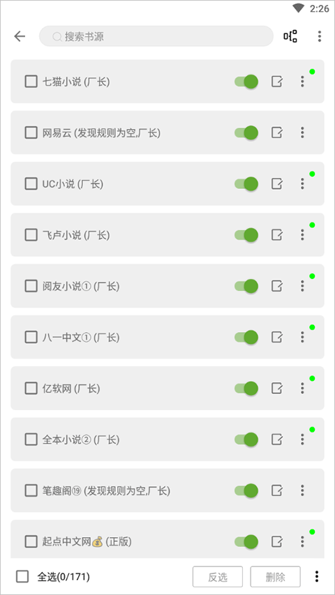 3、可以对书源进行开关、编辑、置顶、删除等操作