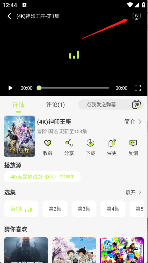 1、点开想要投屏的影视进入,点击右上角的“TV”。