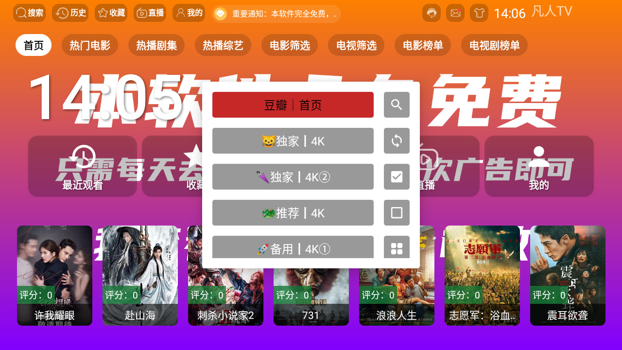 1.打开凡人TV,进入应用点击首页按钮,可以看到各种影视源