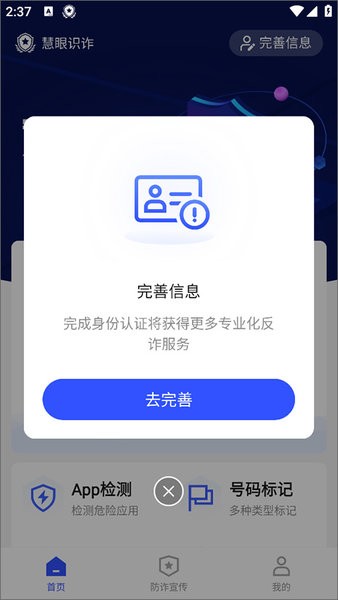 1、当您完成注册后,会进入到“慧眼识诈APP”主界面,在打开主界面时,弹出完善信息界面。