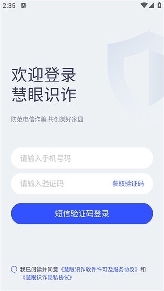 1、用户打开慧眼识诈app,进入登录页面,用户输入手机号验证码即可登录;