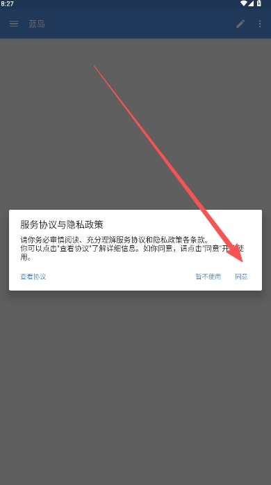 1、点击同意服务协议和隐私政策进入。