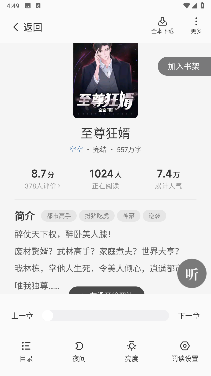 4、还可以将喜欢的书籍加入书架或者开启听书模式哦。