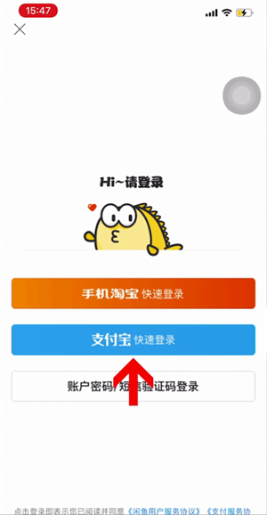 首先打开闲鱼app,点击我的,这时会跳出手机淘宝和支付宝登录页面,