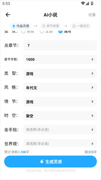 2.点击【AI小说】,进入编辑页面,按照要求输入对应的内容;