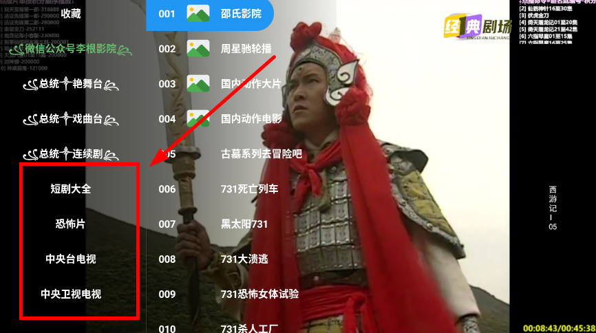 2、跳转到直播频道的播放页后,可以通过遥控器ok键调出左侧频道选择和节目单;