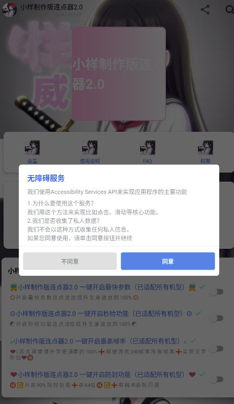 小样制作版连点器2.0是一款专为安卓用户打造的智能自动化工具,兼容各类主流安卓系统,无需获取Root权限即可流畅运行,保障手机系统安全稳定,杜绝刷机风险。软件完全免费,无隐藏收费,使用过程安全可靠,适合各类机型。操作设计简洁直观,只需开启辅助功能权限,即可快速启用自动连点功能。支持自定义点击位置、点击频率、持续时间与间隔时长,精准适配不同场景需求——无论是游戏中的高频技能释放、日常签到,还是抢购秒杀、重复性任务操作,都能轻松应对。设置灵活,响应灵敏,是提升操作效率、解放双手的理想选择。
