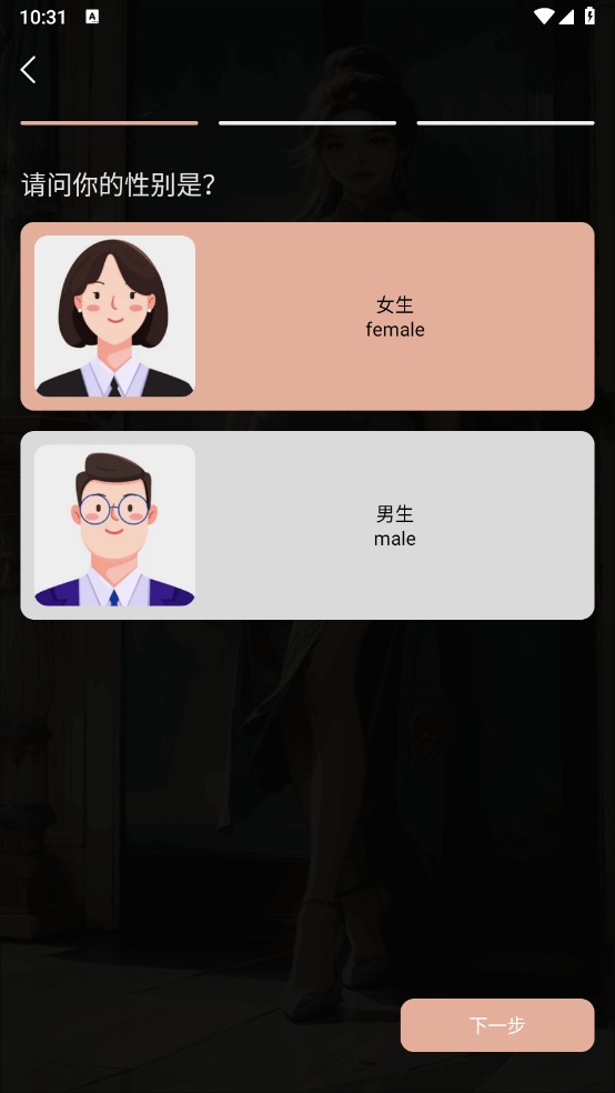 2、选择性别、星座以及虚拟人物特征挑选等。