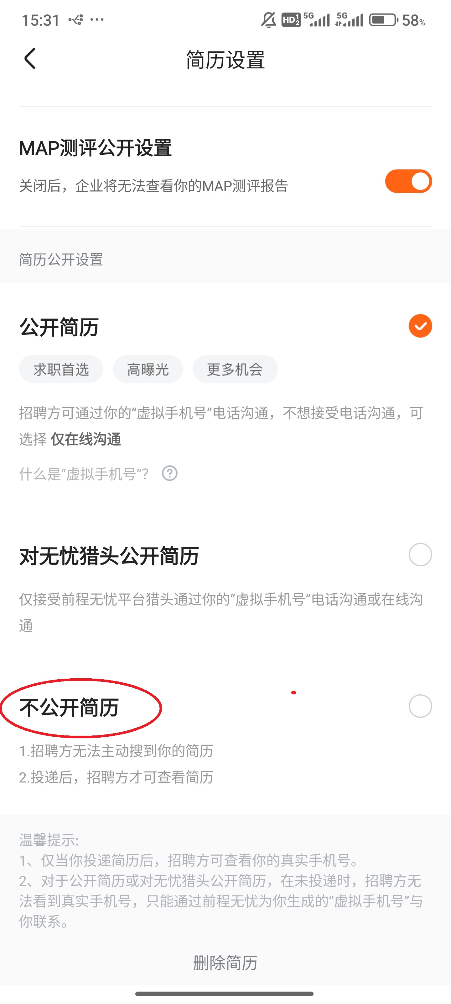 5、可因个人意愿自行选择,简历已经完成了隐藏操作。
