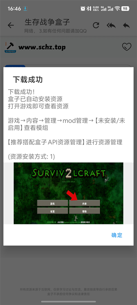 6、下载完成后后打开生存战争手游,点击内容;