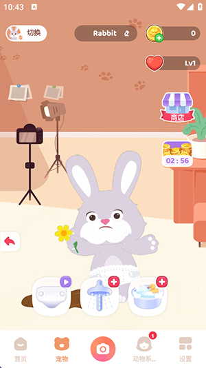 洗澡:模拟清洁过程,触发宠物戏水或撒娇动作。