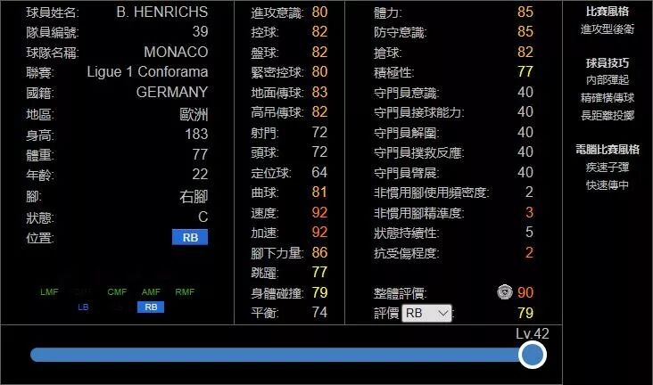 球员:本杰明·亨里希斯国籍:德国球队:摩纳哥模型:183cm/77kg/假脸风格:进攻型后卫总评:79—90技能:长距离投掷,内部弹起,精确横传球